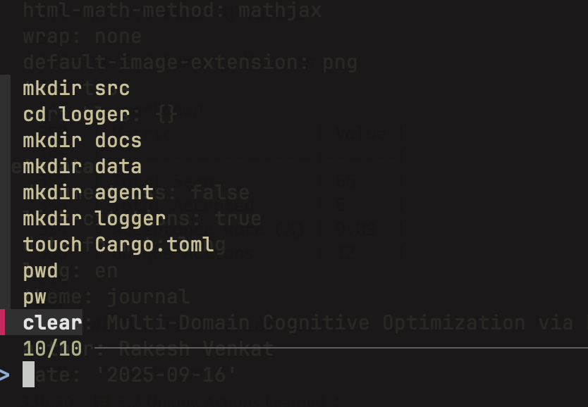 The results show ACON v1.0 learns to prioritize high-value commands (ls, pwd) while discarding low-value ones. Acceptance rates improve over time, validating the feasibility of real-time cognitive optimization.