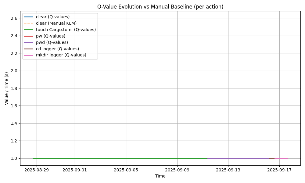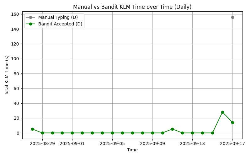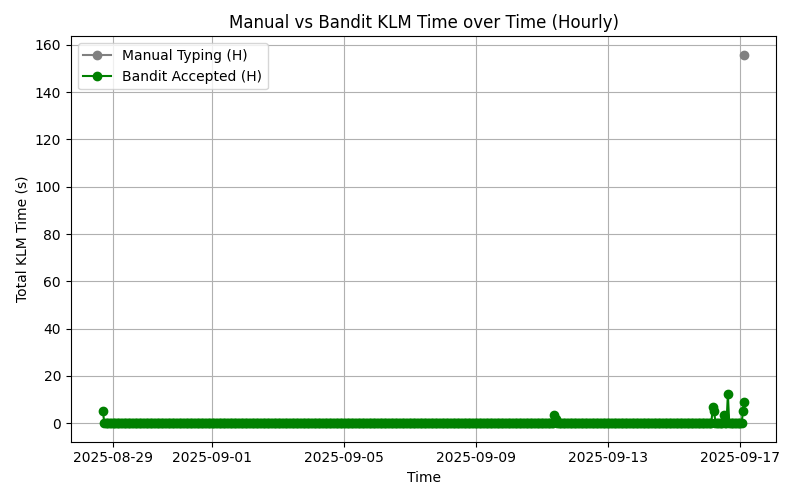 I have evaluated per-command time using the Keystroke-Level Model. Using conservative constants and compared three cases. For the example sequence, the KLM predicts \(\approx 11.4s\) when typed manually and \(\approx 7.94s\) when the bandit suggests the prefilled commands with a time reduction of \(\approx 31\%\). A hypothetical composite macro would reduce the time further to \(\approx6.3s\) with \(\approx 58\%\) reduction assuming the same mental effort.