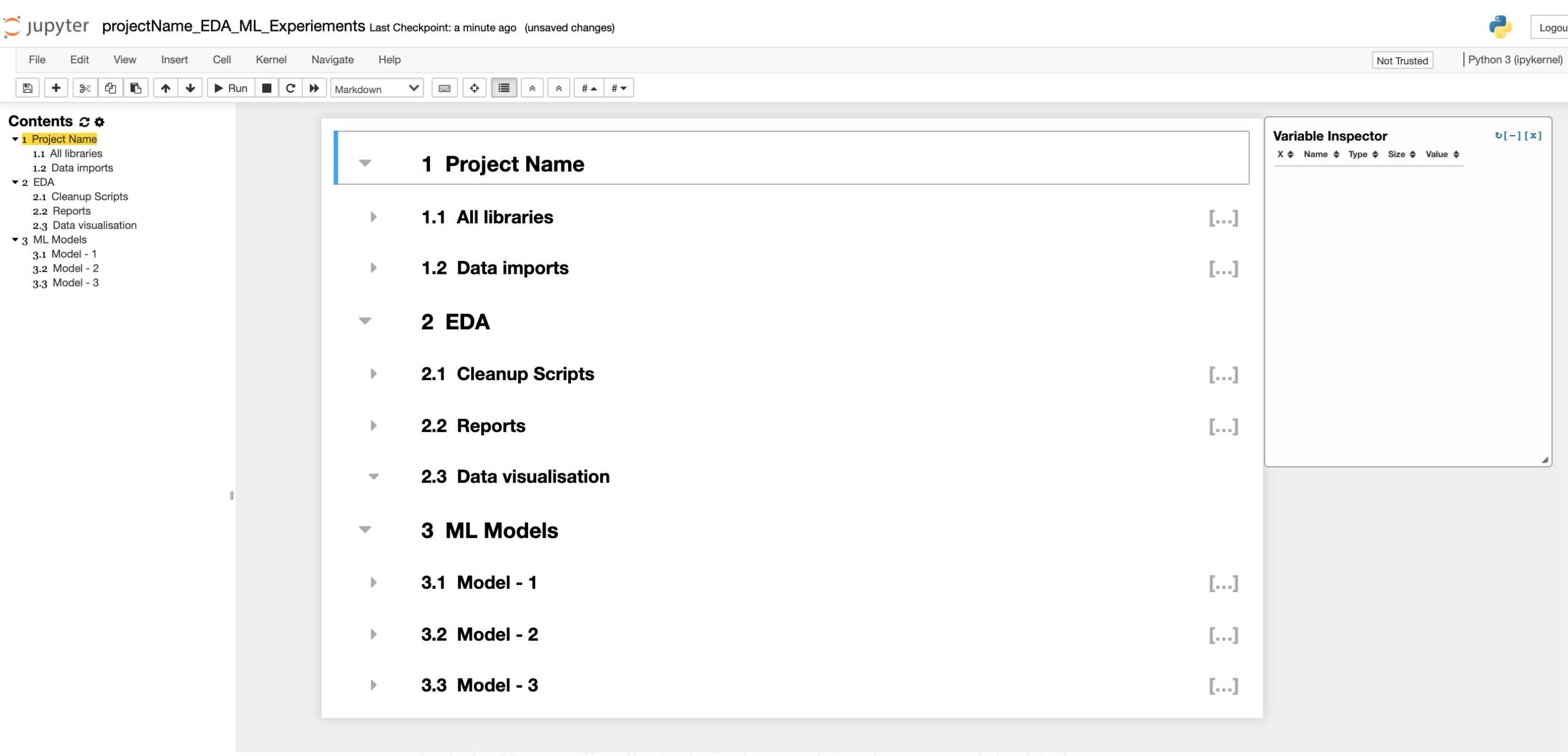 These are the ones which I use — Collapsible Headings, Table of Contents and Variable inspector but feel free to add additional extensions.