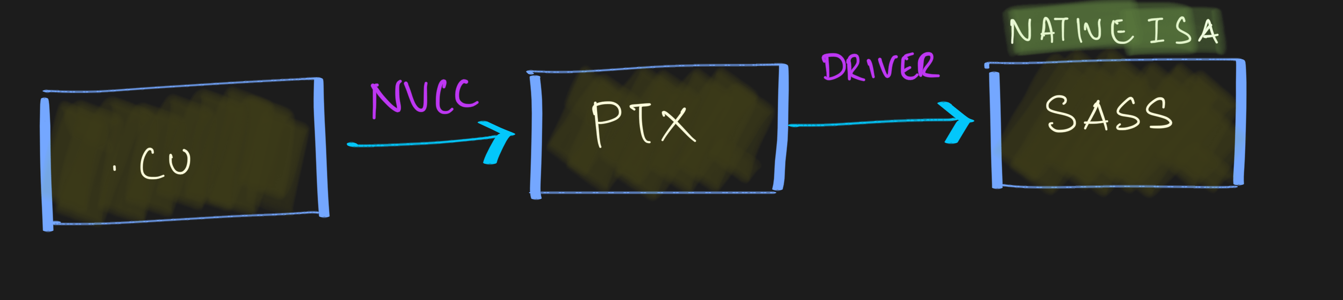 At the same time the 1st pass of the GPU converts the GPU code is converted to PTX code. This is a low level IR (Intermediate Representation) is then compiled to convert it to device specific code known as SASS code.