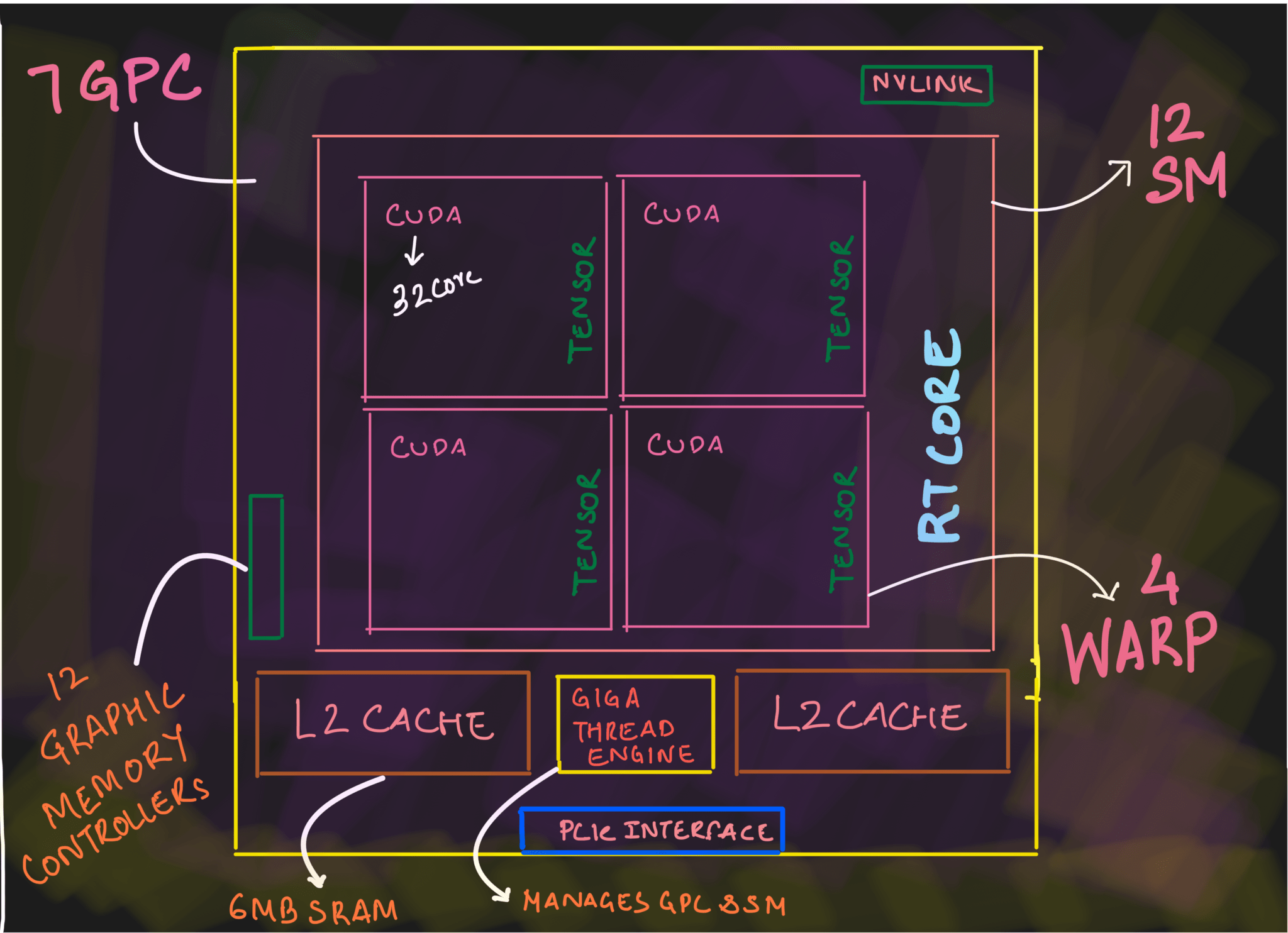 There are : 1. 7 Graphic Processing Clusters (GPC) 2. Each GPC had 12 Streaming Multiprocessors (SM). 3. Every SM will have 4 Warps and 1 Ray Tracing core 4. A single Warp will have 32 CUDA core and 1 Tensor Code. 5. 12 Graphic Memory Controllers 6. Two L2 Cache of 6MB SRAM each 7. NVLink 8. PCIe Interface