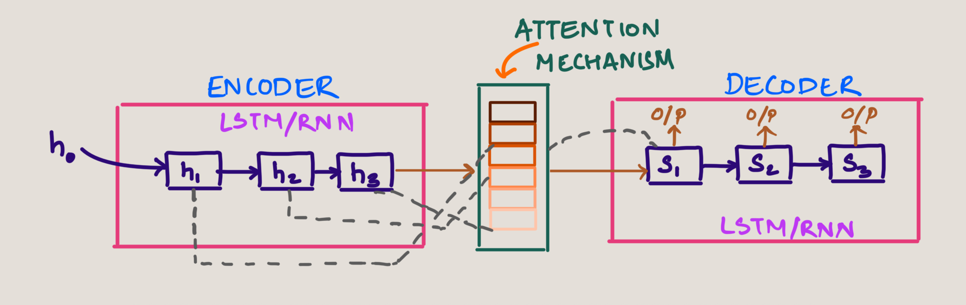 Key Improvement: The decoder (s1) now has access to every hidden state from the encoder stage, giving it context from the entire input sequence. The stronger colored bands in this visualization represent higher attention weights, showing which input tokens the model is focusing on when generating each output.