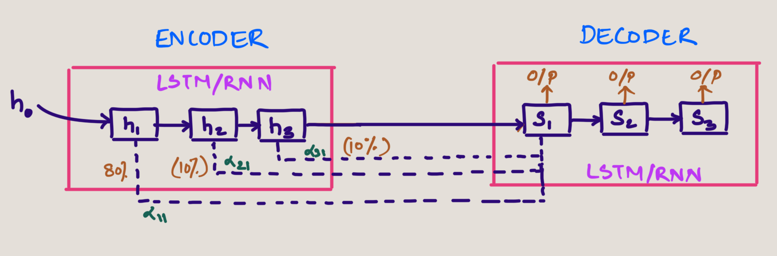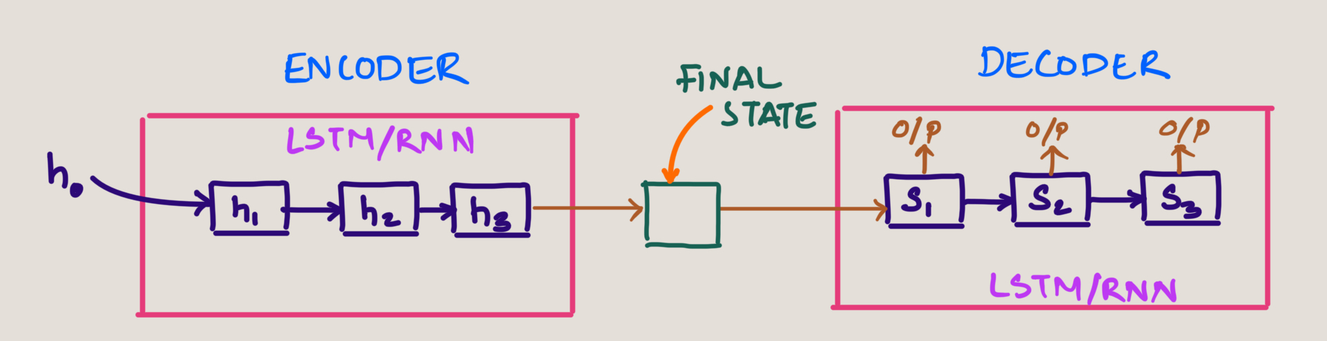 - The encoder processes input token through LSTM/RNN cells, with the final hidden state (h3) passed to the decoder