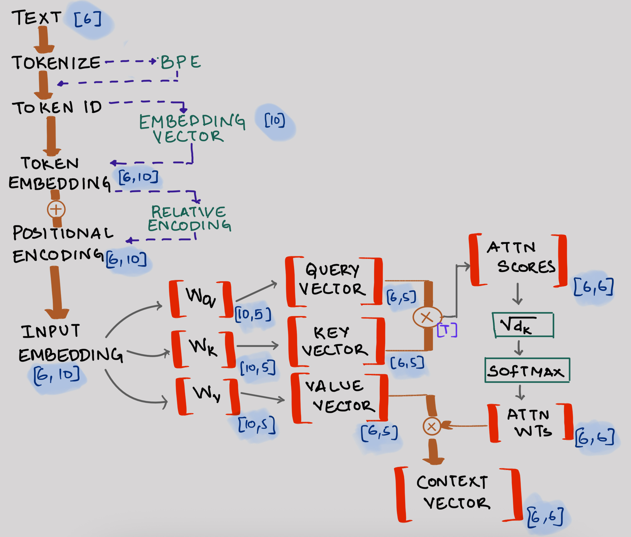 - The numbers in brackets represent dimensions (e.g., \(W_Q\) has dimensions \([10, 5]\))