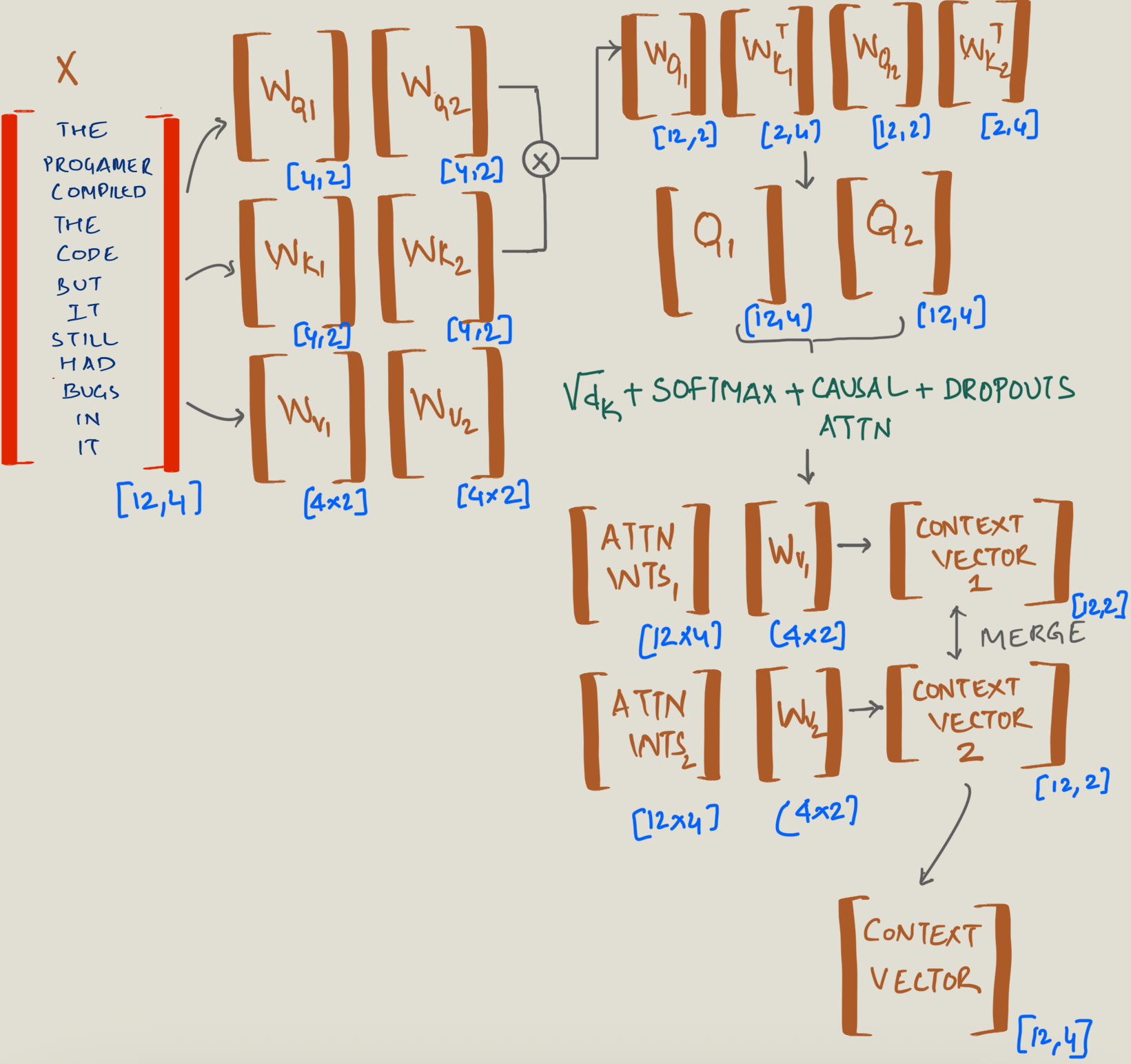# scaling by sqrt(key dimns) + softmax + causal attention + dropouts