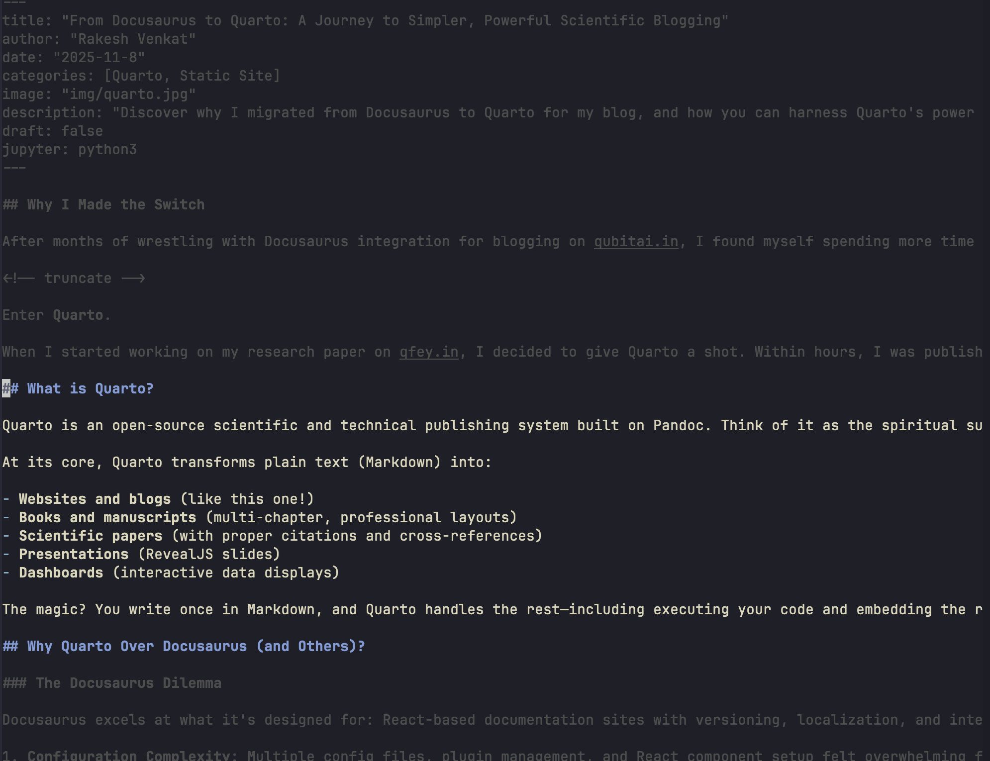 Switching from Docusaurus to Quarto was one of the best decisions for my technical blog. The simplicity, power, and focus on scientific publishing transformed my workflow. I spend less time fighting with configurations and more time creating content.